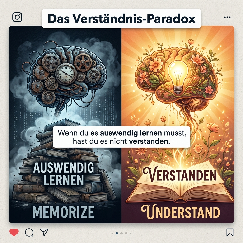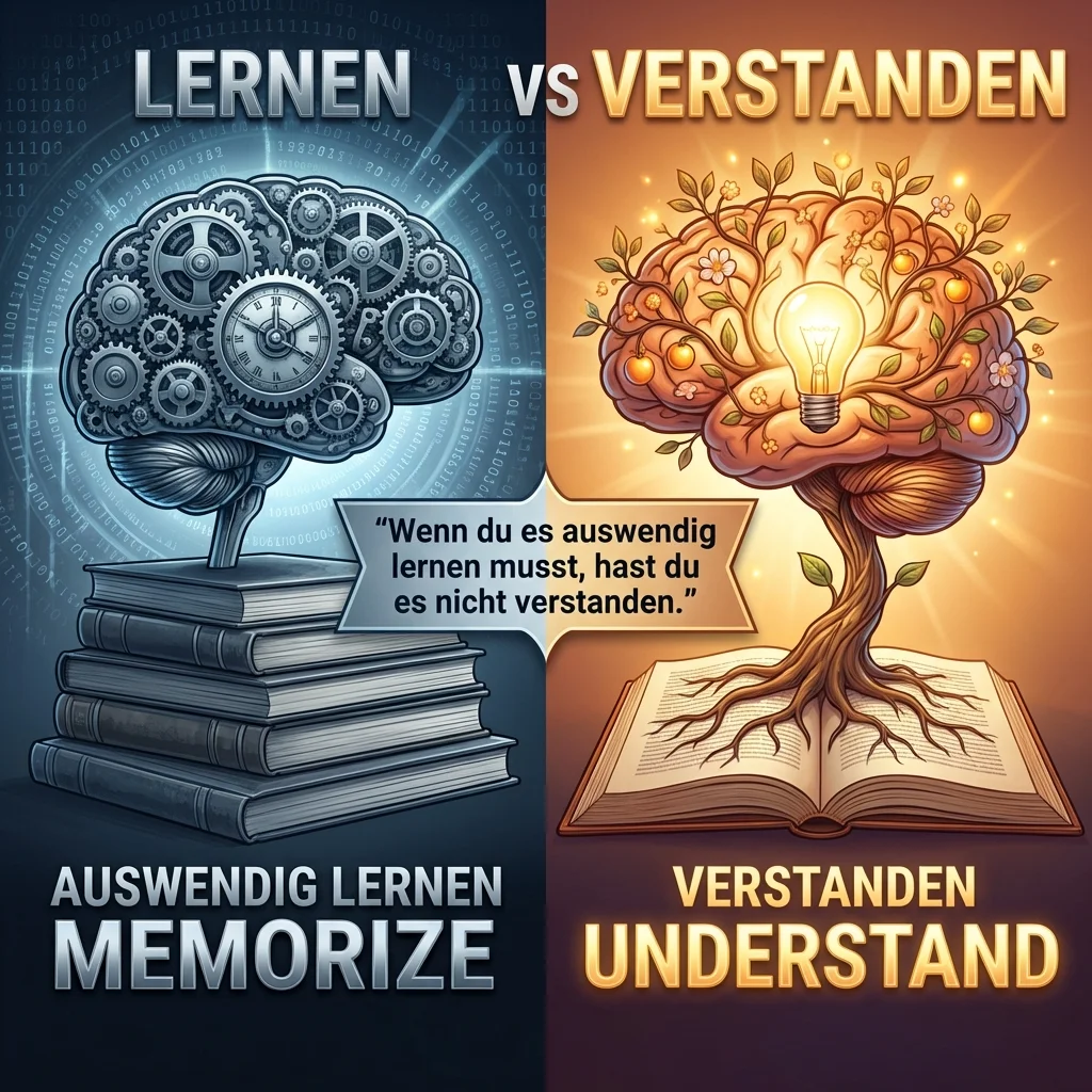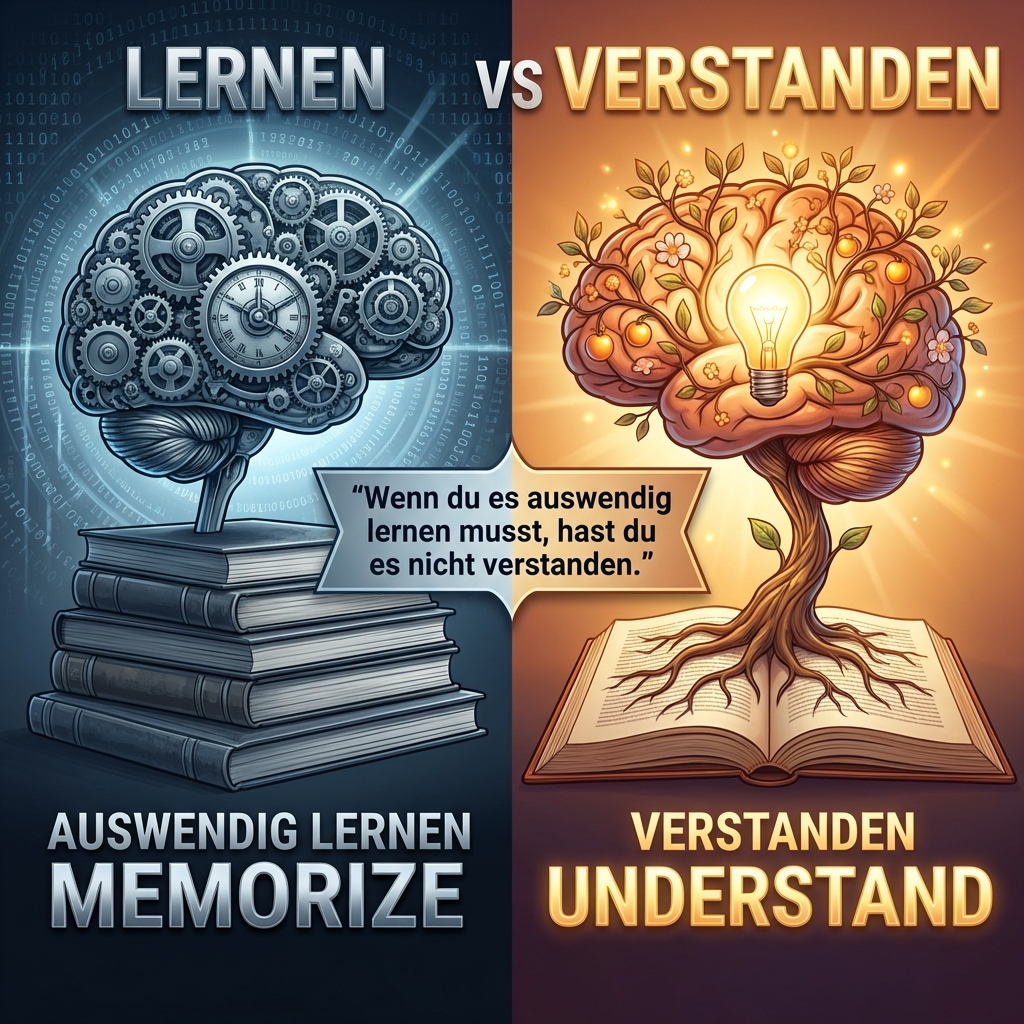 Wenn du es auswendig lernen musst, hast du es nicht verstanden. Visueller Vergleich zwischen mechanischem Auswendiglernen und echtem Verständnis.